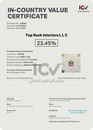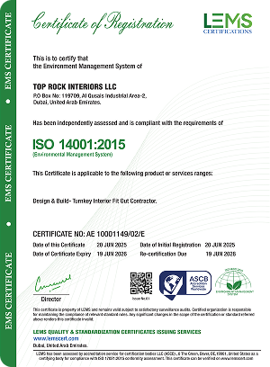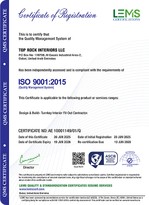 TOPROCK Interiors is certified to ISO 9001:2015, demonstrating our commitment to occupational health and safety. This ensures a safe working environment for all.